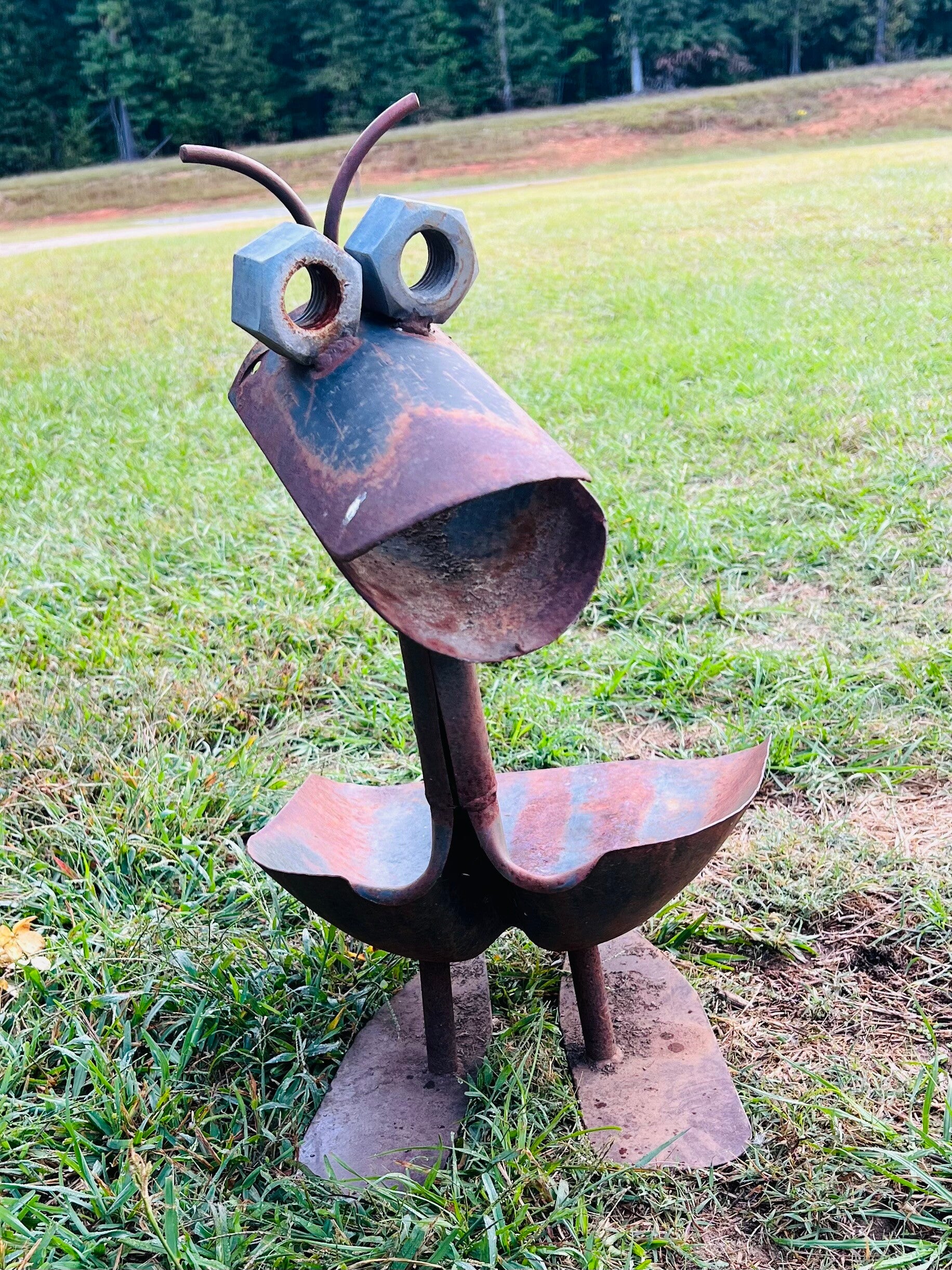 This one of a kind vintage tool and scrap metal duck sculpture measures 25" tall, 25" Depth, and 13" Wide. It is a decorative piece of art created for the home outdoors or garden. Vintage tools used here are the shovel head, post hole digger blades, grubbing hoe blades, and large nuts. This cute duck art will add flavor to your outdoor space and can be a great conversation piece.